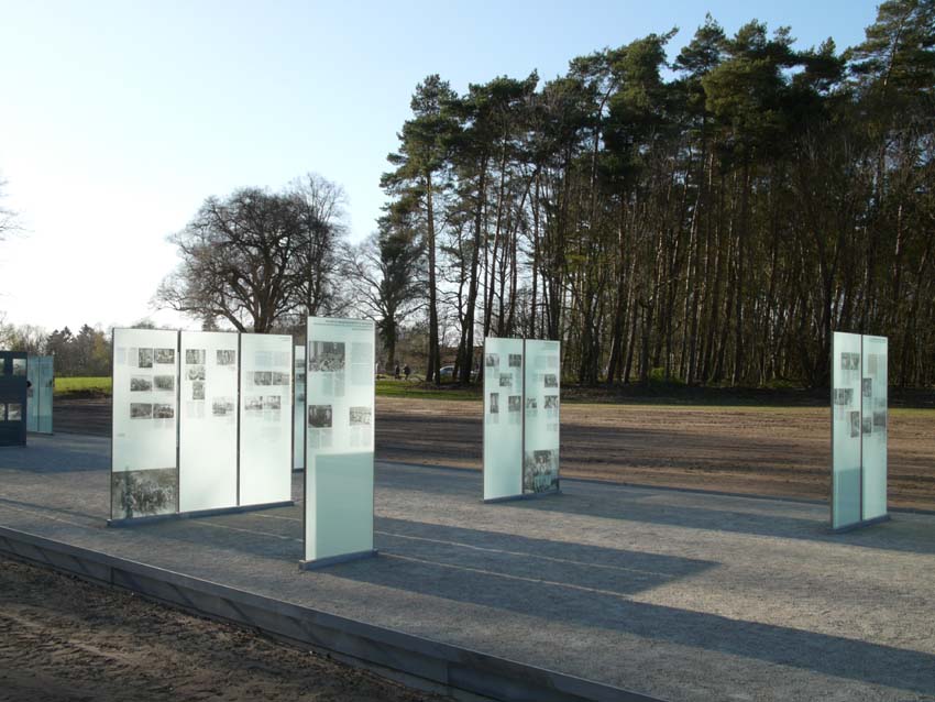 The renovated museum was reopened in April 2010; it still focuses on the historical forest area. A new open air exhibition was set up on the border to the former camp inside the forest, which can be visited even outside the opening hours of the museum. The glass stelae provide information about the evacuation, the death marches, the camp in the woods and the liberation, but also display photos, documents, drawings and testimonies. Their modern and minimalistic design stands out in the natural surroundings. At the very end of the exhibition stands a vitrine with findings such as cutlery, graters (which were used to shred the tree bark for eating) and personal belongings, placed to connect the descriptive area (the exhibition) with the historical one (the forest). Both areas bear witness not only to the individual stories of the prisoners but also to this moment at the end of World War II and the Holocaust.