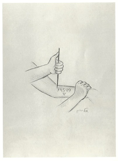 Evidentially, the value of Ella’s art work is incomparable, both as a visual testimony and as an expression of trauma. It is known that in the early days of post-war life, some survivors shied away from confronting the horrors they had witnessed in an attempt for forget and move on. Yet, Ella began, almost immediately, to meticulously create in-depth, detailed depictions of her life during the Holocaust. She writes: “I began to draw, to sketch whatever was released from within me, grey lines on faded paper. I reconstructed each picture shortly after I was liberated. With trembling hands I began to reconstruct the hell from which, by a miracle, my mother and I had emerged.” Her sketches are simplistic but distinct in technique, sensitively documenting the time, space and memory of an event. Not only do they raise our awareness historically, but they pull us in emotionally. Like the written word of a memoir, Ella found her voice via a process of artistic representation. This body of work totalled 93 drawings, without interruption. The sketch below, one example from Ella’s collection, depicts a minimalistic pencil drawing of an arm being tattooed with the number ‘74349’: Ella’s prisoner number from Auschwitz. Ella recalls: “I feel my arm ripped aside. The number 74349 is forever embedded in my blood. This blue ink, which has seeped into my blood, accelerates its flow”. The correlation between this permanently inked marking of the Holocaust on her body, and her continuous flow of pencil sketching is significant. It is as though the ink physically fuels her arm, and provides the impetus to represent and reconstruct this violating act. No longer a name, but a number; two anonymous arms hold hers with a tightened grip and whitened knuckles. We are there with her as a witness in the moment, observers the very moment that the needle touches her skin; the moment in which a brutal and faceless attempt is made in order to eradicate her identity.