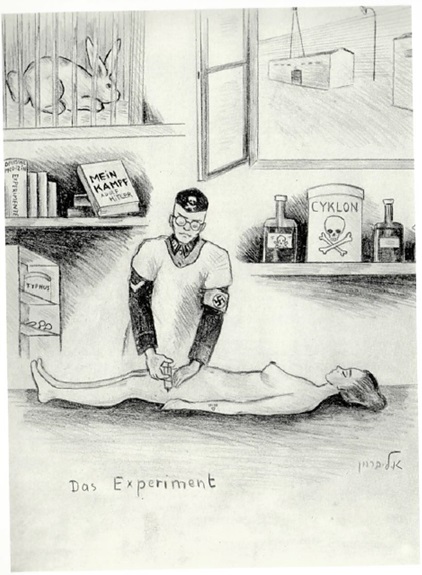 The sketch above, captioned as ‘Das Experiment’, presents a moment in much more graphic detail. Unlike many of Ella’s works which often feature text in Hebrew, here we find only German; it is as though Ella seeks to separate her Jewishness from this scene. Understandable, given what appears to be taking place. Here, Ella frames the notoriously chilling figure of SS Doctor Mengele (known primarily for his ‘scientific’ experiments on prisoners, specifically children and twins). Immediately, we are confronted with symbols associated with death: three skulls, a can of Zyklon poison, and a jar labelled ‘typhus’. Ella narrates: “Human guinea pigs, young Jewesses, were plentiful, free of charge. A doctor, a civilised man with a university degree, watched his clock to see how long before the infant died. All for the sake of science”. Yet, here we do not see shelves filled with medicinal or scientific books: we see a copy of Hitler’s ‘Mein Kampf’. In this decision, Ella subtly and skilfully outlines the influence that Nazi ideology, specifically the absurdity of eugenics and racial purity, had upon medical professionals under the Nationalist Socialist regime, and the power that this notion held above reason and knowledge. Mengele, his clean doctor’s gown barely covering his SS uniform: the lethal combination of officer and doctor, bares a look of both distain and concentration on his face. His expression, cold and cruel, contrasts dramatically to that of the young women on which he operates. Her innocent and sombre appearance, naked except for her camp tattoo, embodies the loss of youth and, in this case, fertility. Lastly, the only other living being in this sketch is the rabbit, caged on a shelf above. The connection between these two helpless victims signifies the value of Jewish life within the camps: as worthy as animals to be experimented on.
