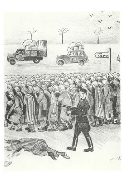 Ella later details a scene from a ‘death march’: another brutal hardship that she and her mother were forced to endure after their survival in the camps. In the heart of winter, with no leaves on the trees and snow on the ground, the prisoners walk for miles to the West under SS guard, as they flee from the approaching allies. Planes can be seen flying overhead, and vehicles full of people speed past. The mass of survivors, dressed in their camp uniforms and bare legs hunch over with their heads down, compliant and faceless. At this point, they have become a number, stripped of their identities. The only two visible expressions in this sketch appear on the face of the concerned survivor who holds an exhausted collapsing woman, and the stern, frowning face of the SS guard. Despite the nature of these last desperate measures of Jewish persecution, he continues his work with determination, force and authority: gun in hand. In front of him lies a corpse, face down in a pool of blood, which he calmly intends to pass. Ella writes: “Trucks and cars loaded down with the bundles of fleeing German civilians rush past us. Whoever falls is shot. The snow is splattered with blood, bodies scattered everywhere”. It is evident that this particular image haunts Ella, for the brutality and graphic detail commands the gaze of the viewer. We are meant to be horrified, and to feel the reality within this representation.