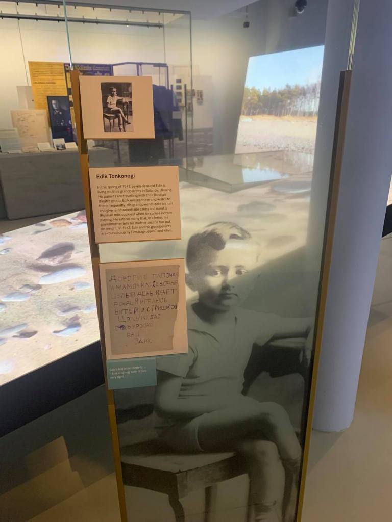 During my placement, I was tasked with all kinds of research duties, including finding photographs of SS perpetrators, photographs of displaced persons, of various “operations” at the beginning of the Holocaust, quotes for the various themed gallery sections, potential former Shtetls across Eastern Europe where footage could be taken – to name only a few. The challenge of finding only contemporaneous documents or sources was difficult at times, yet, I understood the importance of allowing the exhibition to unfold in ‘real time’, and it pushed me to work harder. Some of my most memorable assignments included writing up the process of arrival to killing at the Operation Reinhard camps, as well as understanding the process of sourcing and lending artefacts, which will directly inform my own PhD thesis. Most importantly, I was often asked to finding potential personal stories – for which pre-war or wartime photographs were also available. This included families killed by the Einsatzgruppen squads in the East. As such, I came across the story of Edik Tonkonogi, who lived in Satanov, Ukraine. He wrote letters to his parents who were travelling with their theatre group, on of which is included in the new Holocaust Galleries. In 1942, Edik and his grandparents were rounded up by Einsatzgruppen C and killed. The family, and an example of his letter writing. now has it’s own totem in the exhibition. Similarly, my friend Natali Beige introduced me to her own family narrative when I contacted her for potential stories from Lithuania, which I am moved to say has also been included in the galleries. You can read her story in the section below.