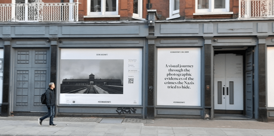 It is hard to miss ‘Seeing Auschwitz’. The entire ground-floor façade of the exhibition venue displays full-length panels with images from Auschwitz, confronting passers-by in the street outside, urging the public to engage and reconsider how we ‘see’ Auschwitz as the abiding symbol of the Nazi genocide.