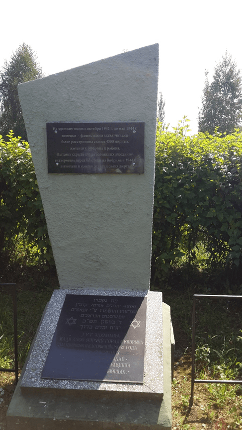 Kobryn today is a typical average Belarussian city of approximately 60,000 residents. There are still monuments of Lenin and Stalin and several others of past heroes and special events. The Second World War, “The Great Patriotic War,” is present, naturally commemorated by statues, signs, and names of streets. As is common in the former Soviet countries, there is hardly any specific mention of the ethnic or national belongings of the “victims of Fascism” on the big monuments. However, at the place of the final mass killing of the city’s Jews in October 1942, I found a board of marble with a Hebrew inscription reading: “Here are buried 4,500 Jews, citizens of Kobryn, who were murdered and destructed by the Nazi German Fascists [a Hebrew date]. May their memory be blessed.” A smaller sign in Hebrew was erected on the former site of the old Jewish cemetery, and there are some smaller monuments of this kind.